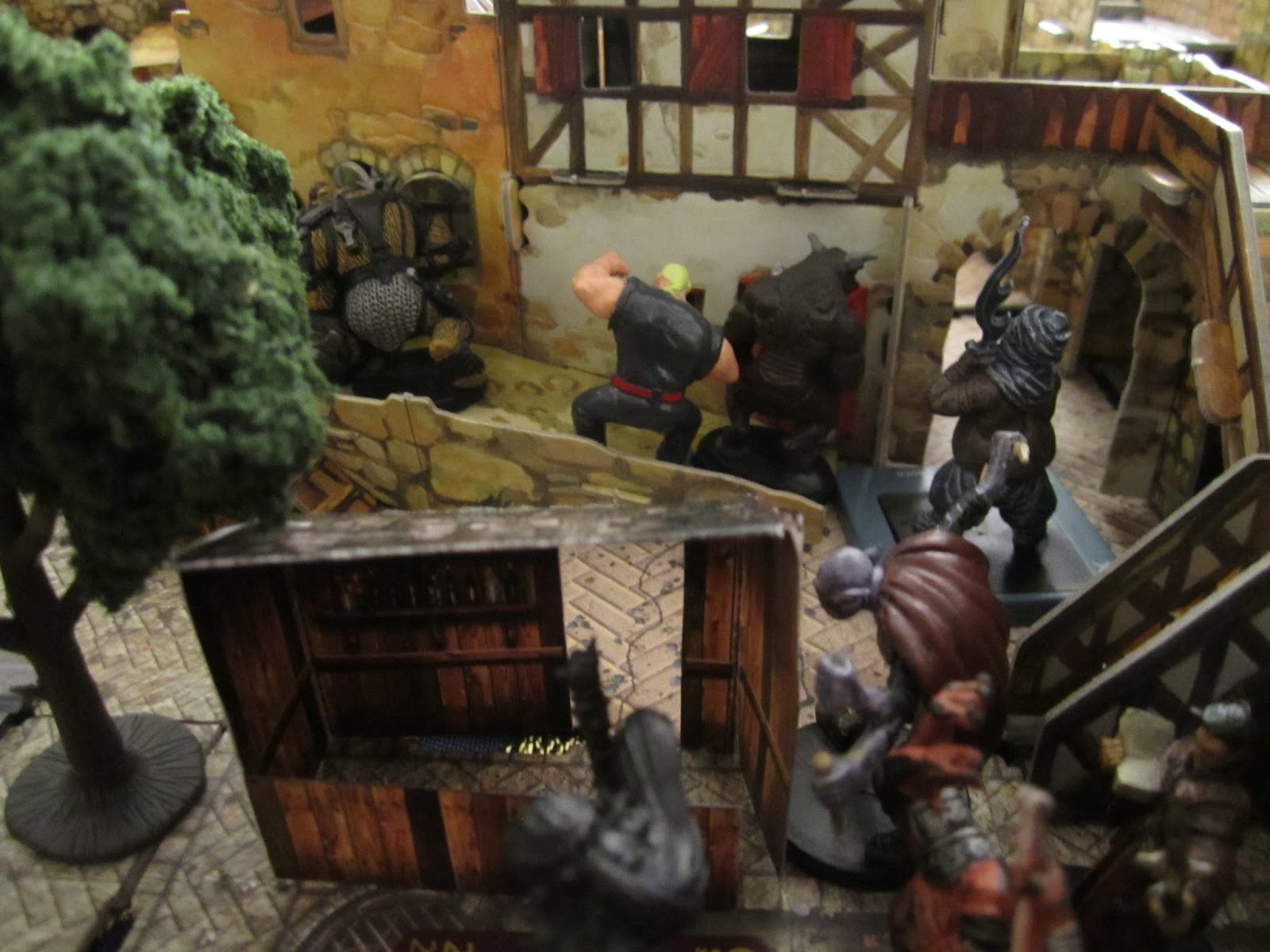 Well, we found out that the refugees are terribly more trouble than we thought. Their behaviour is to run off, away from the closest warband model, if someone approaches too close. However, when models broke into their houses, before they had a chance to step inside (because they cant take any more actions that turn), the refugees would scurry out the windows! Windows and doors are considered unlocked for those inside, and indeed they were running from the closest threat! But it devolved a bit into a slight Benny Hill chase scene... (which is not totally out of place for this game, truth be told...).